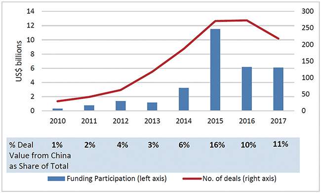 在2018年8月美国外国投资委员会改革签署成为法律之前,通过美国风险投资基金推动的中国投资允许中国公司获得美国技术资产,而用于传统的外国直接投资交易却不受同样严格的规则和披露要求。风险投资基金通常不需要公开报告他们的投资 - 既不是他们收到的投资来源,也不是他们投资的目标。 同样,创业公司可以选择是否公开披露来自融资轮次的信息,其中可能包括筹集的资金和参与投资者,但他们通常不会分享每个投资者所贡献的金额。由于这些原因,很难量化中国风险投资公司每年投资美国创业公司的总金额。