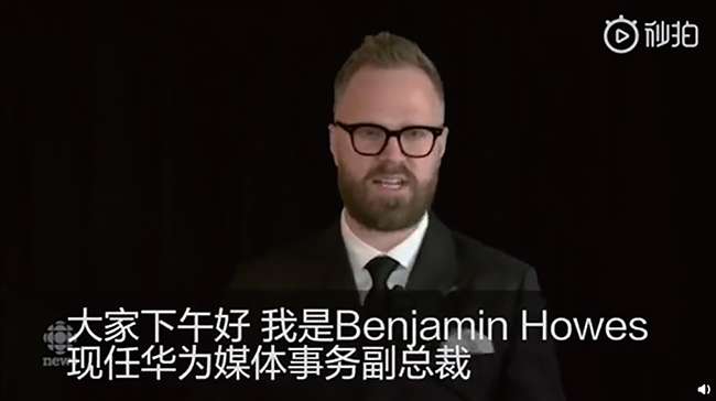 华为媒体事务副总裁Benjamin Howes 发表声明。(图片来源:中新社“国是直通车”官方微博视频截图)