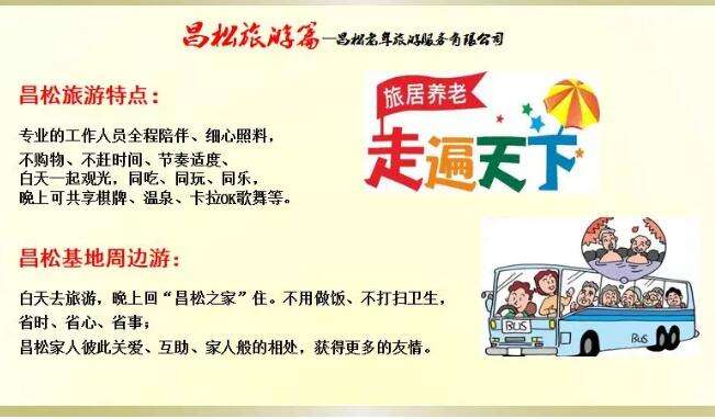 同时,会员们以昌松之家为大本营,结伴三五知己出行漫游,欣赏周边独特的民俗文化,别样的风景,品尝当地特色的风味饮食,达到吃住玩的自主式健康享老生活。