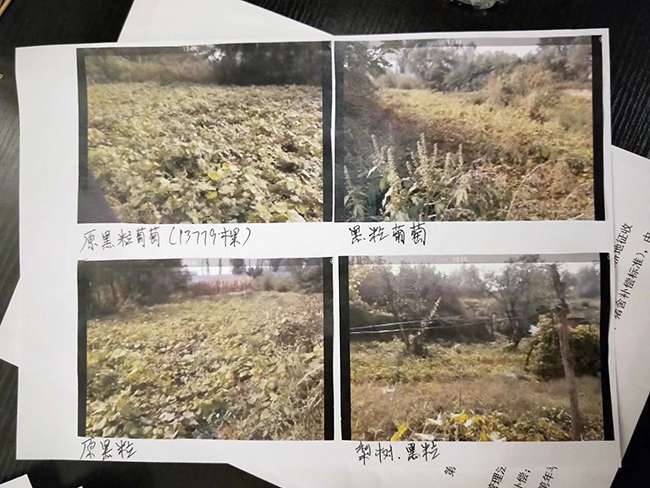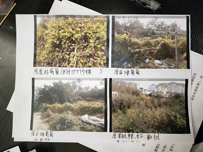 (4)有7亩(含3.6亩菜地每亩28万元共计1008000元)3.4亩山林地,每亩13万元共计442000元,在此地块种植7亩葡萄树,共计10717棵,每棵350元,共计3750950元,有开荒地11亩,其中9亩种植葡萄树13773棵,每棵350元,共计4822650元。