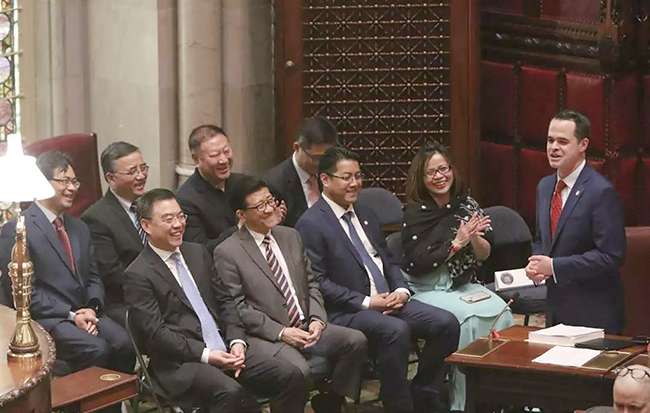 6月18日,纽约州参议院一致通过决议案,将2019年10月1日设为“中国日”(ChinaDay),将该月的第一周设为“华裔传统周”(Chinese American Heritage Week)。中国驻纽约总领事黄屏大使应邀见证决议案审议通过,并同纽约州参议员广泛会见交流。纽约州助理众议长奥提兹,提案人、州参议院银行委员会主席桑德斯、卡鲁其等州参议员,州内多个华裔社团代表以及钱进副总领事等参加有关活动。