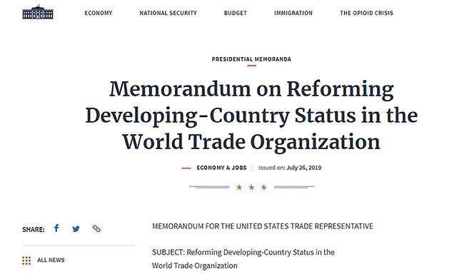 2019年7月26日美国白宫官网发布《关于改革世贸组织中发展中国家地位的总统备忘录》。以下是国际贸易法评论译文:
