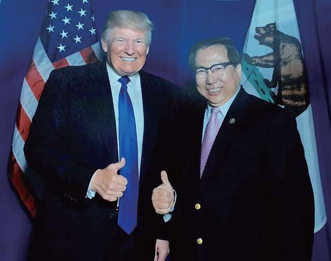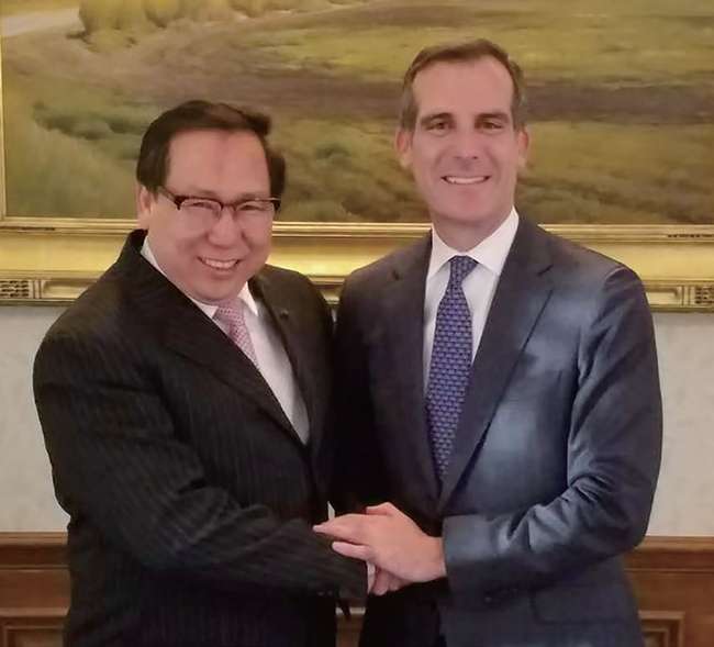 2018 年6 月,主席庄佩源(左)与洛杉矶市市长(右)见面商讨洛杉矶未来发展。