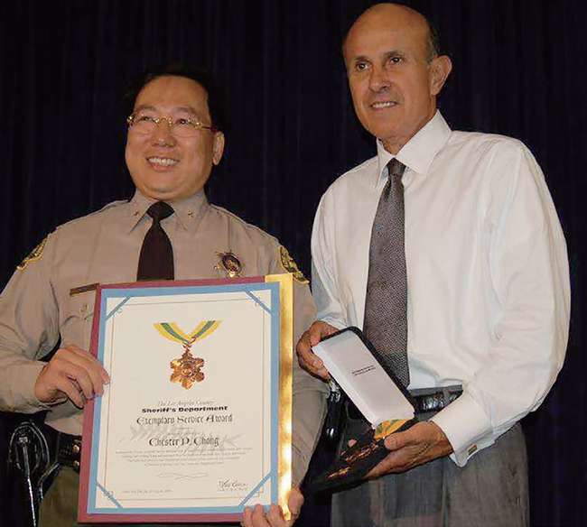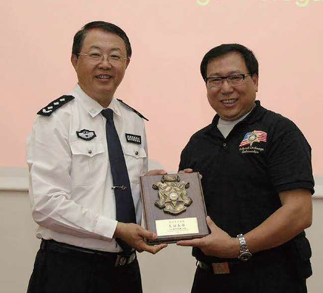 2004 年,洛杉矶县警队1 佰多名警官访问深圳公安局,庄佩源指挥官(右)代表警队颁发纪念奖牌给公安局李明局长(左)。