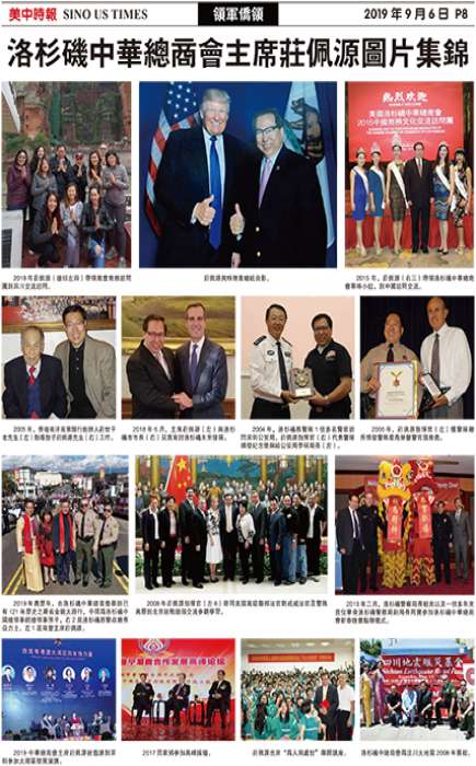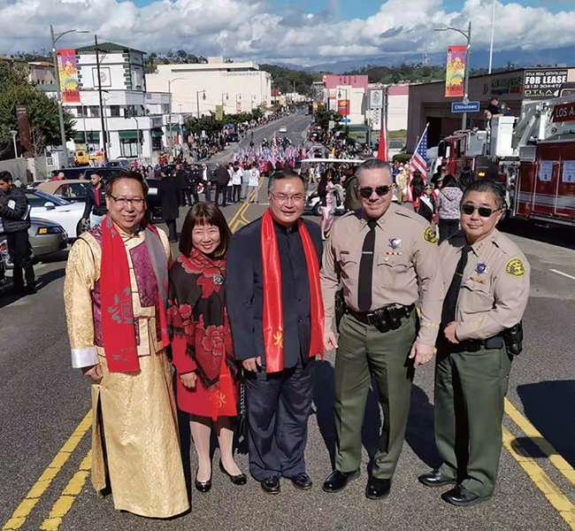 2019 年农历年,由洛杉矶中华总商会举办已有121 年历史之罗省金龙大游行,中间为洛杉矶中国总领事馆总领事张平,右2 是洛杉矶县警政厅长亚力士,左1 是商会主席庄佩源。