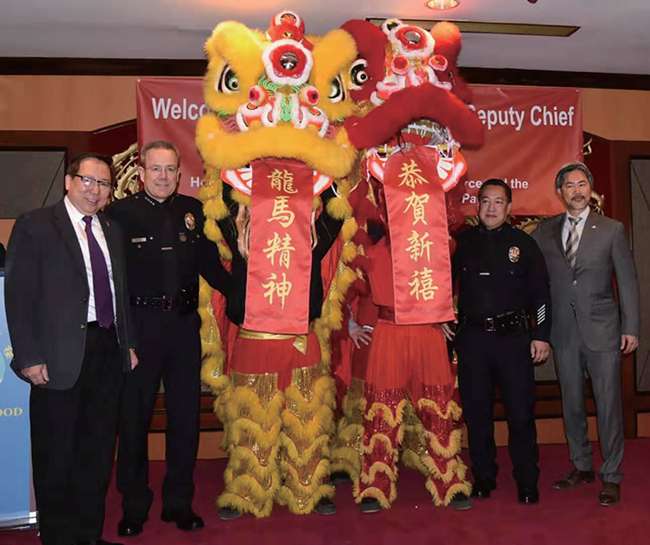 2019 年二月,洛杉矶警察局长帕克以及一佰多年来首位华裔洛杉矶警察局副局长周宝参加洛杉矶中华总商会新春晚会点狮仪式。