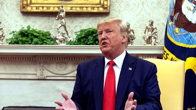 美国总统特朗普在白宫椭圆形办公室接受媒体采访(2019年9月11日)。