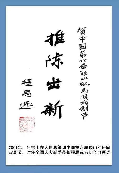 2001年,山西企业家冯福虎要在城中村盖一座大剧院,但村里路不通。路不通,意味着无法建剧院。即使建起来,也没人去看。这样企业家冯福虎十分焦虑。他请吕吉山出山策划。吕吉山出手不凡,创意太原市委市政府支持农民唱大戏,新华社,《人民日报》、《光明日报》、《经济日报》、《中国改革报》等一大批国家主流媒体纷纷报道,引起太原市委市政府极大关注。不到半个月,太原市委书记带领四大班子领导到工地考察后决定,太原市委市政府拿出3000万人民币给他修路。这位企业家不仅仅获得政府金钱支持,而且还得到了全国人大副委员长程思远,全国政协副主席万国权,杨汝岱亲笔题词支持。国务院有关领导,原文化部王蒙部长,中国记者协会主席邵华泽等亲笔题词支持。人民日报等国内主流媒体200多家,报道了吕吉山的策划,国内一大批著名歌唱家王昆、李默然、关牧村等明星到这家企业义务演出。吕吉山还为这家企业策划创办了中国第六届映山红民间戏剧节,均取得了轰动效应。
