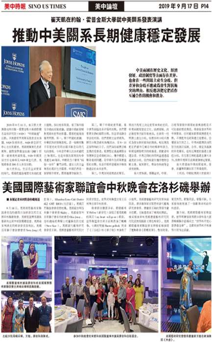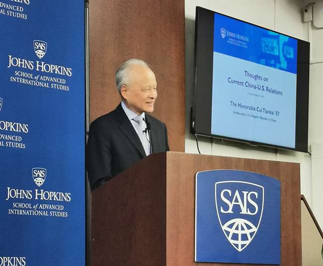 2019年9月11日,崔天凯大使应邀出席约翰·霍普金斯大学国际关系高级研究院(SAIS)“中国论坛”活动,并就当前中美关系发表主旨演讲。SAIS院长科恩、SAIS东亚研究中心主任凯尔德、美国前贸易代表希尔斯、国际货币基金组织(IMF)前第一副总裁利浦斯基、SAIS中国项目主任毛学峰及SAIS学生代表、美智库学者300多人参加活动。