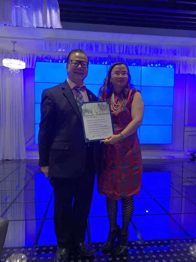 美国圣盖博市议员廖钦和给美国国际艺术家联谊会主席杨采烨(金凤凰)颁奖励证书。