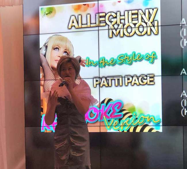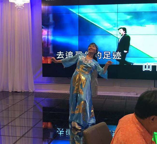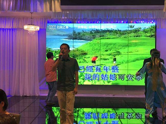 美国南加州湖北同乡会会长张明巨在唱歌。