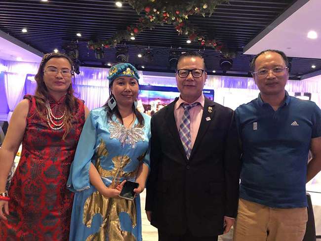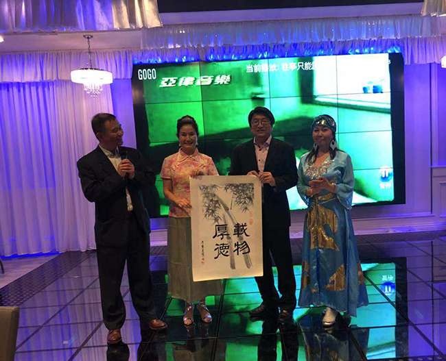 美国国际艺术家联谊会主席杨采烨(左一)、美国艺术研究会会长书画家王敏(左二)、美国圣盖博市议员廖钦和(右一)与北京文化产业有限公司董事长陈成一起合照。