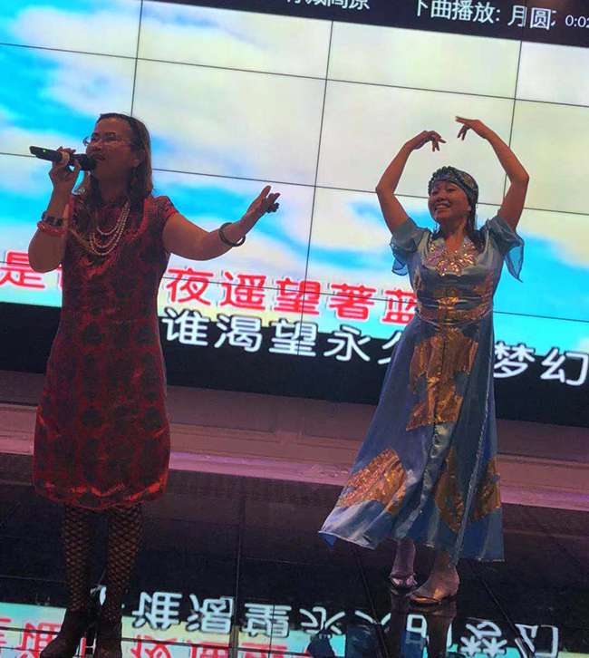 美国国际艺术家联谊会主席杨采烨在演唱(青藏高原)由(美国艺术研究院会会长书画家王敏)伴舞 。