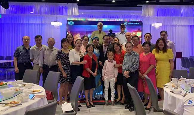 参加中秋晚会的来宾和美国圣盖博市议员廖钦和合影留念。