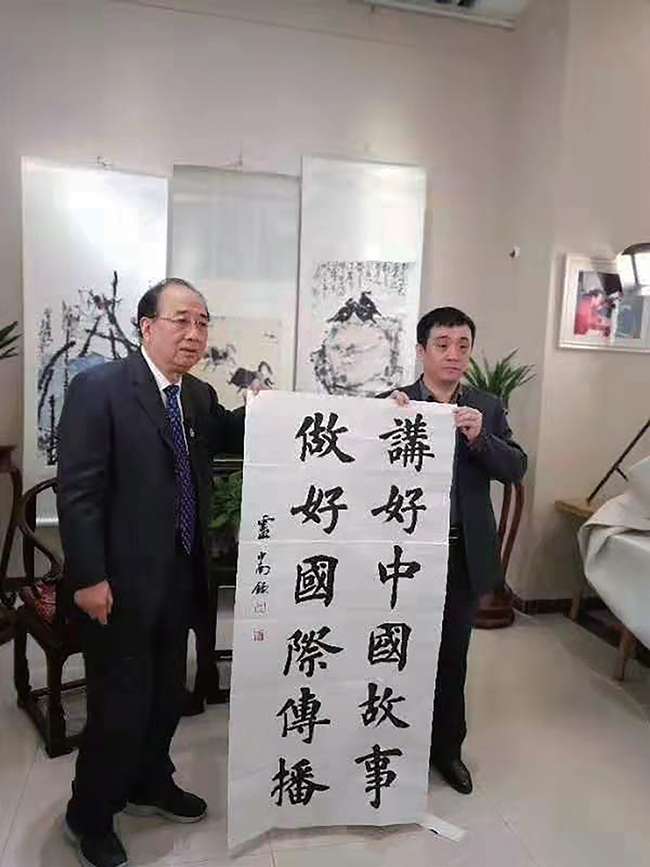 潘基文在众人的簇拥下走进拍摄场地,当潘基文先生看到“忠义仁勇”四条屏的时候,他自己滔滔不绝的讲起了“忠义仁勇”,讲起了孔子、庄子、老子,他讲的兴起,早就忘记了约定的15分钟拍摄时间。