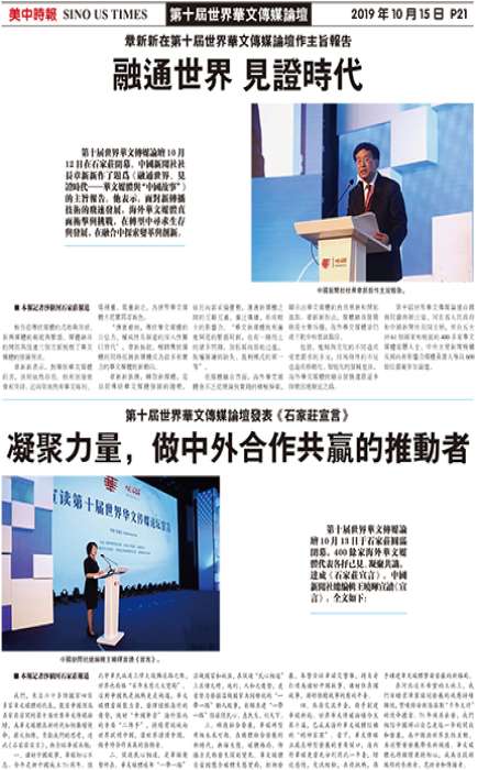 第十届世界华文传媒论坛10月12日在石家庄开幕。中国新闻社社长章新新作了题为《融通世界、见证时代——华文媒体与“中国故事”》的主旨报告。他表示,面对新传播技术的飞速发展,海外华文媒体直面冲击与挑战,在转型中寻求生存与发展,在融合中探索变革与创新。