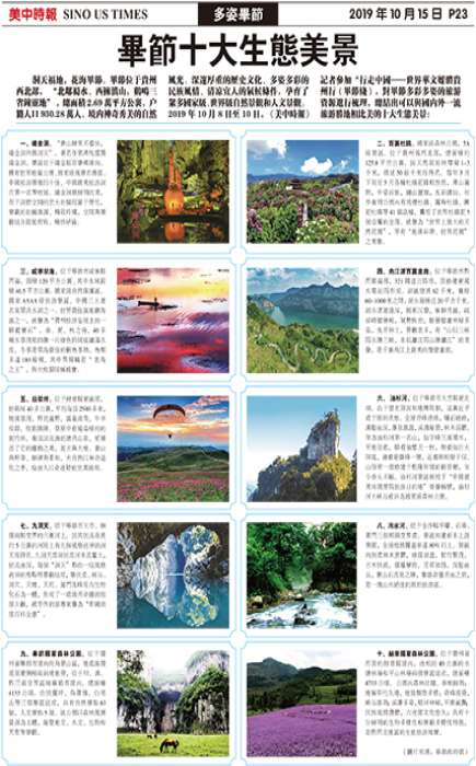 洞天福地,花海毕节。毕节位于贵州西北部, “北邻蜀水、西拥滇山,鸡鸣三省钟灵地” ,总面积2.69万平方公里,户籍人口930.28万人。境内神奇秀美的自然风光、深邃厚重的历史文化、多姿多彩的民族风情、清凉宜人的气候条件,孕育了众多国家级、世界级自然景观和人文景观。2019年 10 月 8 日至 10 日,《美中时报》记者参加“行走中国——世界华文媒体贵州行(毕节线),对毕节多彩多姿的旅游资源进行梳理,总结出可以与国内外一流旅游胜地相比美的十大生态美景: