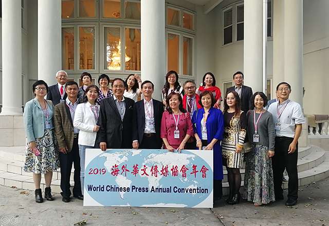 海外华文媒体协会代表在休斯顿“白宫”门前合影留念。