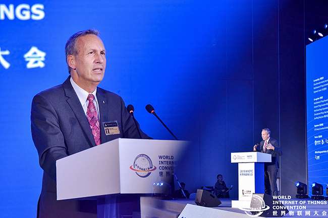 世界物联网大会主席何绪明在主题报告中回顾了历届大会的昨天,纵观今天物联网发展现状,展望世界物联网发展明天。他介绍了物联网工业、物联网能源、物联网金融保险、物联网交通车辆、物联网健康医疗、物联网智慧城市、物联网人工智能、航天航空、军事科技、航运物流、文化旅游、生态环保等17个产业领域组成的世界物联网架构系统和新经济体系。指出现在的物联网发展正在新兴起步阶段,在推动数字经济智能化、社会发展进步的同时,促进了社会变革和产能转型的产业革命,大众生活、生产、工作正迈向智慧化的时代,且突飞猛进。随着全球5G网络的商用,为物联网这个集数字化、智能化为一体的人与物交互共享的生态网络提供了技术保证。5G为物联网产业经济市场的构建安装了起动器,世界物联网为公平、公正的世界经济带来了千载难缝机遇。中国占到全球物联网产值1/4左右,2025年全球物联网产值有望达到30万亿美元的市场体量。