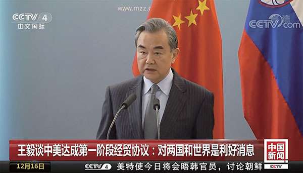 王毅表示,中国一直不赞成用加征关税来解决经贸摩擦,因为贸易战没有赢家。中国也反对单方面施压的做法,因为不符合世贸组织的规则。经过双方团队反复沟通折冲,中美终于就第一阶段经贸协议达成一致,美方承诺分阶段取消加征关税。这一协议旨在解决双方各自的关切,体现了相互尊重的精神,也是平等协商的结果。这一协议符合中国经济高质量发展的内在需要,符合中美两国人民的共同利益,符合国际社会的一致愿望,有利于中美经贸关系逐步恢复稳定正常发展,有利于为正在下行的世界经济注入信心,有利于为全球贸易秩序带来稳定性。