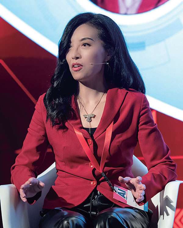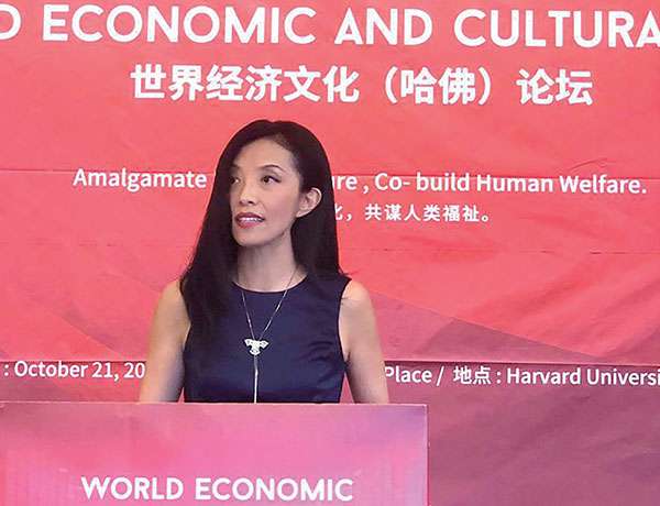 2018 年,范晓莉在美国波士顿哈佛大学“世界经济文化(哈佛)论坛”上讲话。