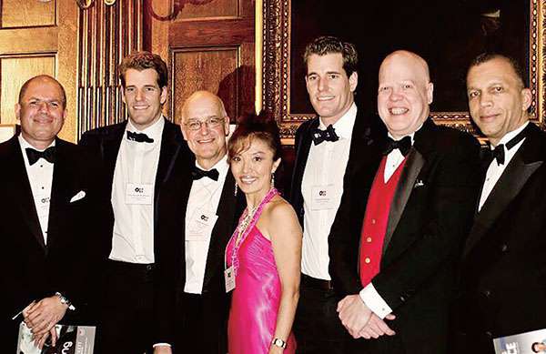 2012 年,脸书原创人,比特币推手,北京奥林匹克美国队赛手 Winklevoss 兄弟受范晓莉(Sally Fan) 之约与纽约大学校长参加牛津剑桥纽约联谊盛典。