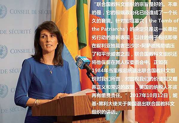 美国常驻联合国代表妮基·黑利大使说,联合国教科文组织的宗旨是好的。不幸的是,它的极端政治化已经造成了一个长久的窘境。正如在1984年当里根总统退出联合国教科文组织时我们所言,对敌视我们的价值观又嘲弄正义和常识的政策,美国的纳税人不该再有缴费责任。
