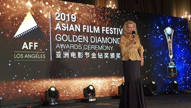 AFF亚洲电影节共同主席利思·伊顿在洛杉矶AFF亚洲电影节金钻奖颁奖盛典致辞。