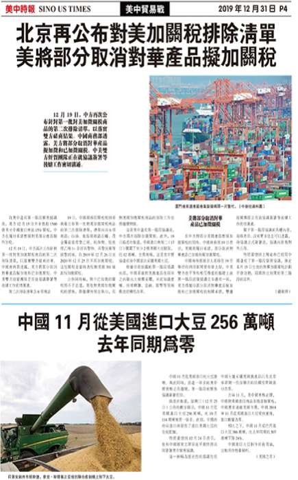 这是美中达成第一阶段协议后,中方再次排除加征关税。此外,19日路透社报道,中国进口商周二(17日)购买了至少2艘美国大豆船货,约12万吨,交易商称,这是美中贸协达成后中国首次采购美国大豆。