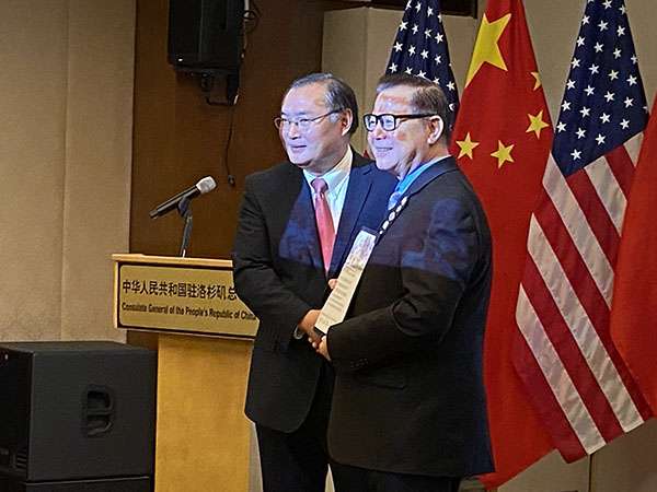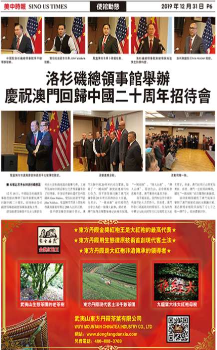 12月18日,中国驻洛杉矶总领事馆在馆内举办了招待会庆祝澳门回归中国二十周年,招待会由洛杉矶总领事馆副总领事施远强主持。