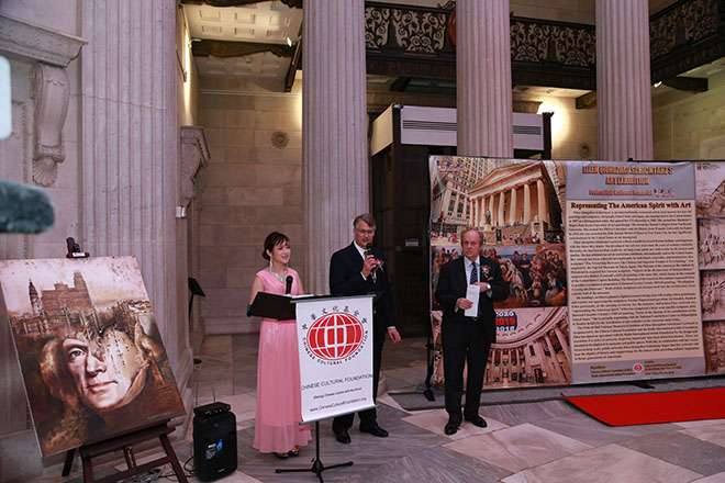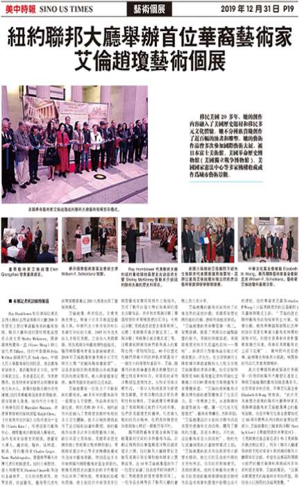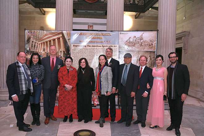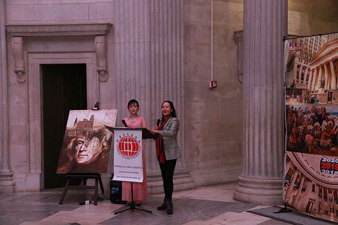 纽约当地时间12月20日,中华文化基金会(CCF)和罗丹国际艺术家基金会联合在纽约联邦大厅国家纪念馆主办了著名美籍华裔公共艺术家艾伦赵琼.希克坦兹博士(Ph.D Qiongzhao Ellen. Schicktanz) 的油画作品展览。同时也为了纪念美國總統、国父乔治·华盛顿将诞辰288周年,特别展出了青铜小浮雕作品[华盛顿总统率军渡河],巨幅油画[美国感恩节历史再现]等。国会议员格蕾丝·孟(Grace Meng)办公室为艺术家艾伦赵琼所做出的艺术贡献颁发了荣誉奖证书。