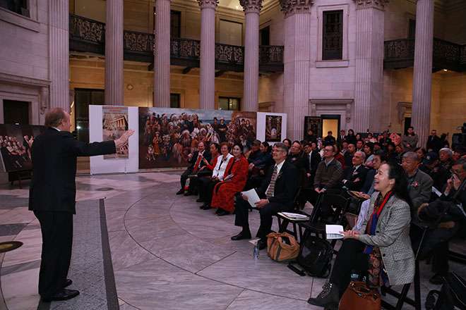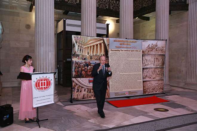 此次在华盛顿曾宣誓就任美国第一任总统的联邦大厅历史遗址上举办艾伦赵琼的艺术个展意义非凡,也非常荣幸和光荣。中华文化基金会Elizabeth B.Wang 总裁说:“此次在具有历史意义的联邦大厅举办著名美籍华裔艺术家艾伦赵琼博士的艺术个展,也是中华文化基金会庆祝成立16周年庆典系列活动的重要组成部分。艾伦赵琼的三幅青铜浮雕(3feet by 6 feet)《华盛顿总统率军渡河》、《美国独立宣言签名者》和《美国联邦宪法制定者》,明年(联邦大厅建筑维修工程结束后)将捐赠给联邦大厅国家纪念馆,希望在这里再现开国元勋们的丰功伟绩和美国两百多年前的历史场景。艾伦赵琼说:“这里承载着历史的凝重和未来的希望,将给后人以无限的启迪与激励。”