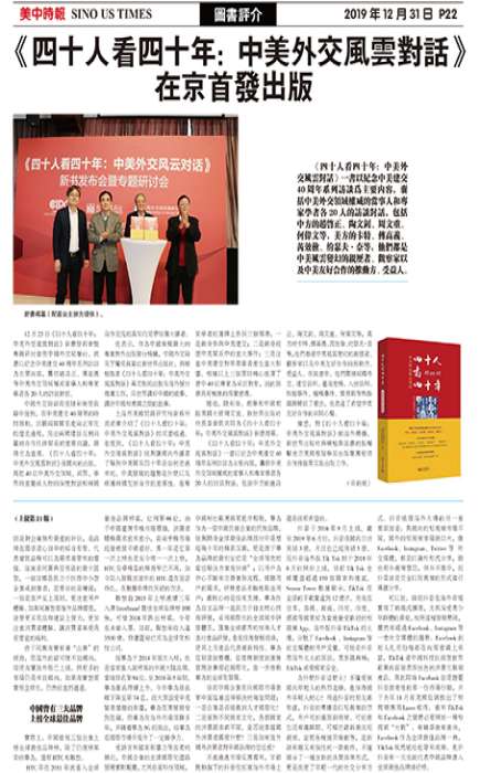 12月23日《四十人看四十年:中美外交风云对话》新书发布会暨专题研讨会在中国外文局举行。该书以纪念中美建交40周年系列访谈为主要内容,囊括赵启正、傅高义等中美外交领域权威当事人和专家学者各20人的访谈对话。