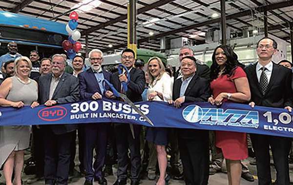 比亚迪北美公司兰卡斯特工厂第300辆电动大巴下线