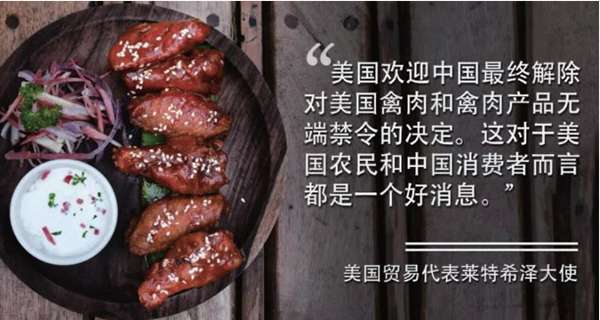 2019年11月15日,美国驻华大使馆网站消息,美国家禽饲养者重新获得中国市场准入。美国贸易代表罗伯特·莱特希泽和美国农业部长桑尼·珀杜就此发表声明。“美国欢迎中国最终解除对美国禽肉和禽肉产品无端禁令的决定。这对于美国农民和中国消费者而言都是一个好消息。”莱特希泽说。“对于美国的家禽饲养者来说,中国是一个重要的出口市场,我们估计他们现在每年将能够向中国出口价值超过10亿美元的禽肉和禽肉产品。”珀杜说,“已被拒之门外多年的美国家禽生产商和出口商欢迎中国对其产品重新开放市场。”由于美国2014年12月爆发禽流感,中国已于2015年1月起禁止进口所有美国禽肉,即便美国自2017年8月起已无禽流感。2013年,美国对中国的禽肉产品出口额超过5亿美元。美国是全球第二大禽肉出口国,去年向全球出口禽肉和禽肉产品价值达43亿美元。