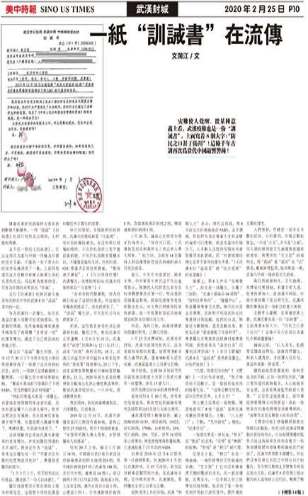 这份《训诫书》的被训诫人就是现在驰名中外的武汉8个“造谣”者中的一位。