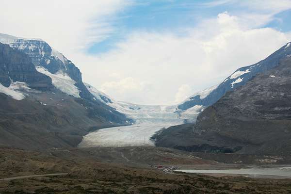 从哥伦比亚冰原旅游中心观景台观看对面的冰川,中间的道路就通到阿萨巴斯卡冰川