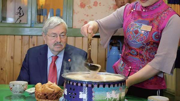 2018 年,布兰斯塔德大使去了内蒙古呼和浩特访问,了解那里的农业发展以及农业教育的情况, 并品尝了当地的特色菜肴。