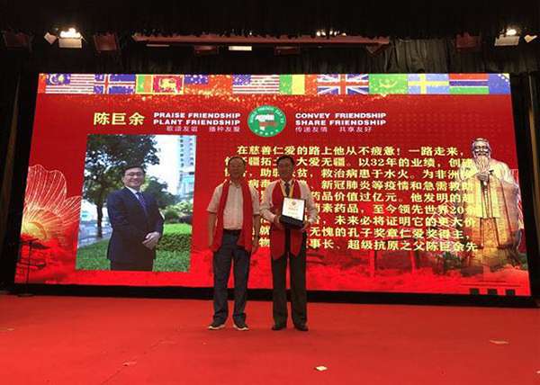 孔子奖章组织委的颁奖词是:在慈善仁爱的路上他从不疲惫!一路走来,他开疆拓土,大爱无疆。以32年的业绩,创建协合,助弱扶贫,救治病患于水火。为非洲埃博拉病毒、非典、新冠肺炎等疫情和急需救助的人群累计捐赠药品价值过亿元。他发明的超级抗原高聚生金葡素药品,至今领先世界20余年,救治无数患者,未来必将证明它的更大价值。他就是当之无愧的孔子奖章仁爱奖得主,协合生物集团董事长、超级抗原之父陈巨余公爵。