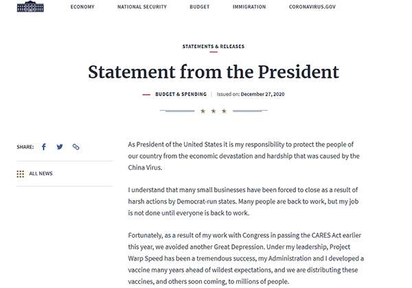华盛顿时间12月27日,白宫发表总统声明,强调“必须解决选民舞弊问题!”