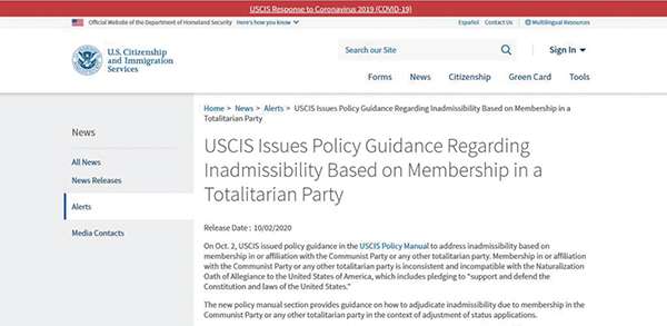 美国公民及移民服务局(USCIS)10月2日)发布政策指南,明文强调凡是申请移民的共产党员或其他极权主义政党的党员或与之相关的成员,都不会获得受理。