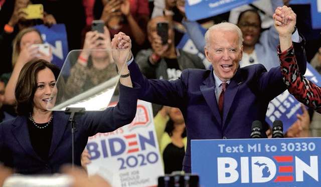 2020 年3 月,拜登和哈里斯在竞选活动现场。