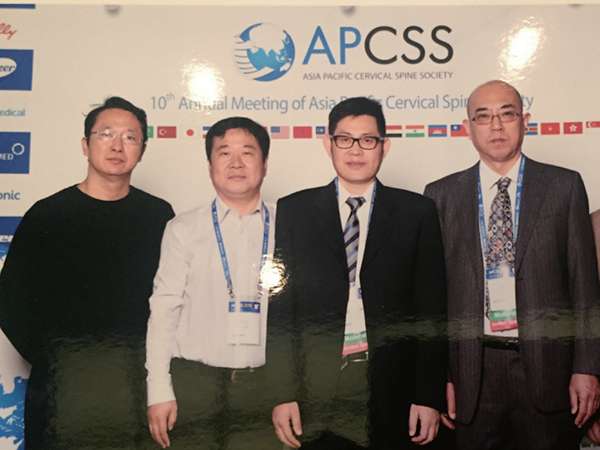 2016 年参加韩国首尔第十届亚太颈椎外科学会年会,宋涛教授(左一)与北京协和医院神经外科李永宁主任(左二)北京宣武医院神经外科菅凤增教授(右二)三博脑科医院神经外科范涛教授(右一)合影。