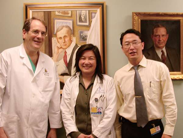 2007 年在美国霍普金斯医院访问学者期间,宋涛教授(右一)与神经外科主任Henry Brem 教授(左一)、导师Judy Huang 教授(中间)合影留念。