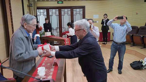 当天下午的仪式上,钱中文先生向社科大赠书,张政文校长接受赠书,并向钱先生颁发赠书纪念牌。主办方还安排了抽奖活动。钱先生抽奖,中奖者获得有钱中文先生签名的《文学的乡愁》。