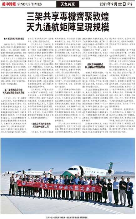 2021年9月9日,中国共享专机模式的引领者天九通航集团旗下的三架专机——天九一号飞虎队、神龙队、雄鹰队齐聚敦煌莫高国际机场,举办了盛大的“雄鹰号”专机首飞仪式。