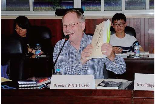 美国当代诗人布鲁克·威廉姆斯(Brooke Williams) 向与会学者展示他随身携带阅读的《陶渊明的幽灵》英文版复印件。
