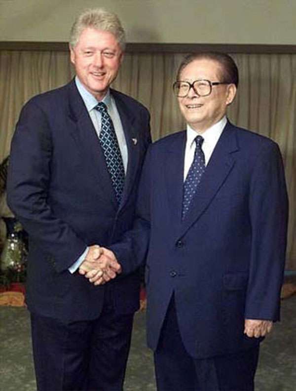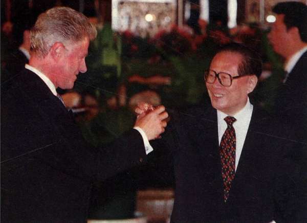 1993年11月19日,江泽民与美国总统克林顿在西雅图的雷尼尔俱乐部举行正式会晤。