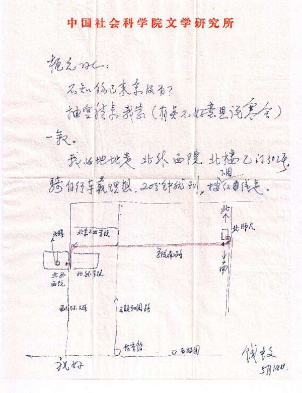 曾经听别人说起,钱中文老师有意将我调进中国社科院文学所来,他同时看中的还有福建的南帆。我受宠若惊,心存感激。大约是1987年初夏,我来北师大为童庆炳老师的研究生上课,童老师转来钱老师的信,邀我到他府上坐坐。钱老师怕我不认路,特意在信中画了一幅地图,仔细地绘制出他家的位置,并且用红笔标明最捷便的路线,还交代我“骑自行车最方便,20分钟就到”。