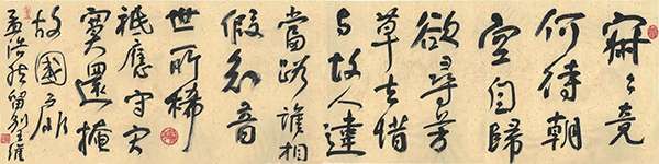所谓“体正”,指茆永忠的书体、书道,是习书的正路、正理、正气、正体之意。他花费多年,在追本溯源中拼命地吮吸传统的乳汁,在历代先贤的书法宝藏中摄取玉液琼浆,深得传统书艺之真谛,在白纸黑字中挥洒诗情词意,在字里行间里表露人生感悟,在置陈布局中化入时代新机,孜孜于在“形式上求变化,在内容中求精神”,走的是一条在传统基础上求新图变之正道。所谓“气虹”,是指茆永忠的书法“行笔如行气”“行气如虹”“气贯长虹”,给人以大气磅礴之感;也是形容他的书法是对“力、气、神”的综合追求。神是书作的灵魂,神随气而生,气虹而神足;力是书作的外部表现,是通过用笔来显示的,气旺则力强,气弱则力弱;气的运用是形成书风的关键所在。再说“意长”,是指茚永忠书作的品位、趣味和意味的悠远深长,是指他的书作给人留下的总体感觉,既是书体结构风格化的品位,也是寓于形式风格中的意蕴,恰是书法艺术最本质的东西。为此,他以一种解悟后的胸有成竹,满怀对中国传统文化的深情,以书为心画,散我怀抱。他的书法崇尚天然率真的审美境界,以无刻意做作为佳,以随意落笔皆得自然为尚,形成了“凌云健笔意纵横”的朗朗书风。
